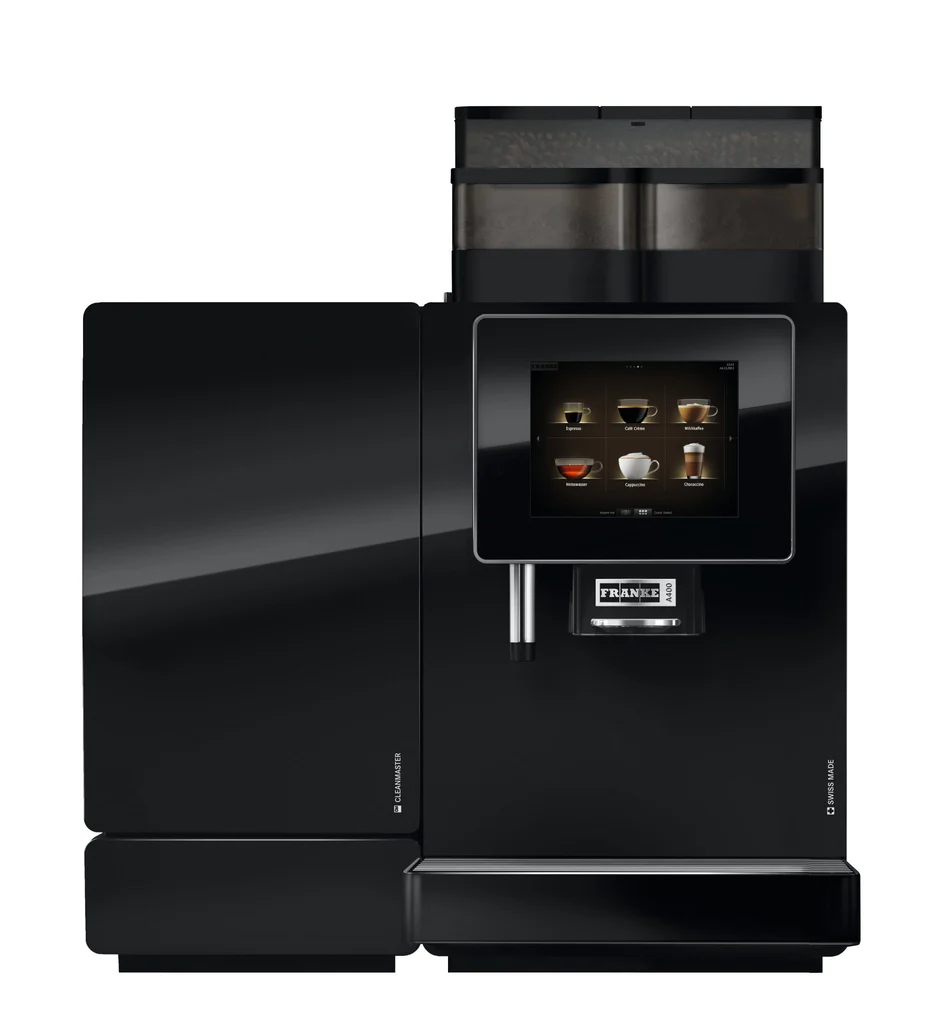 Summary The Franke A400 is a compact, Swiss-engineered super-automatic designed for small to medium businesses, delivering a broad range of premium coffee drinks with consistent results. It features the MS milk system, an intuitive 8-inch touchscreen, and an integrated automatic cleaning program, with flexible configuration options to suit various service needs. Energy-efficient operation and options for water tank or mains connection make it a practical, hygienic choice for offices, cafés, restaurants, and convenience stores.